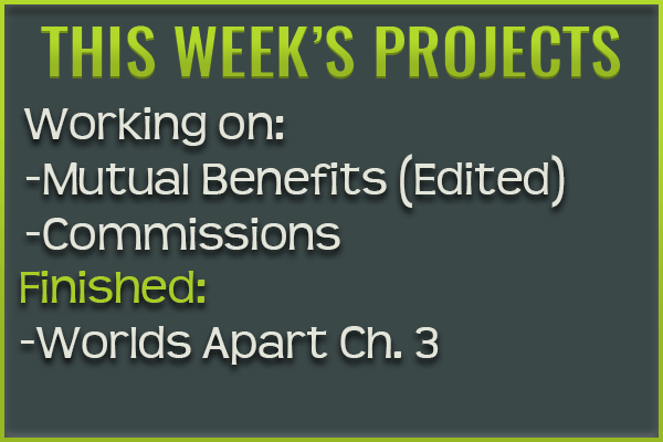 This month I want to focus on getting Mutual Benefits fully edited – I’m about five chapters in, but I’ve been working through it at a snail’s pace. I’m overworked, and I’m sorry to leave you all hanging on that. I’ll do what I can. I’ll talk to you all next week.